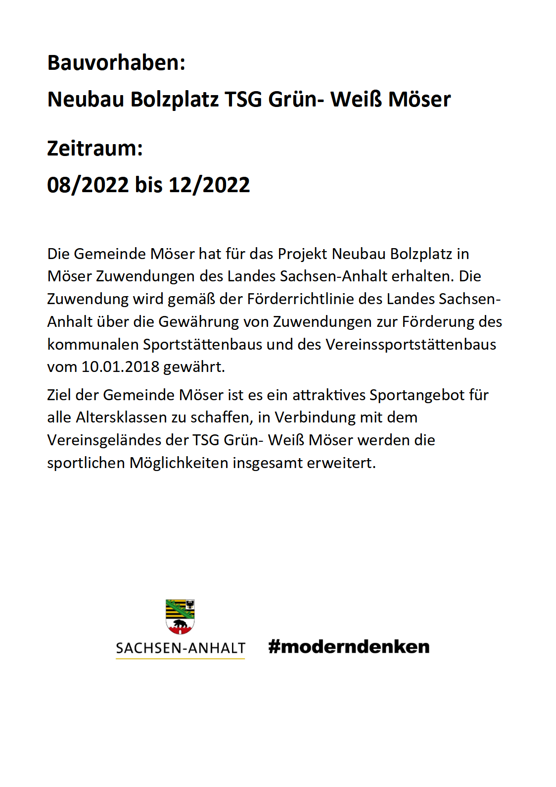 Die Gemeinde Möser hat für das Projekt Neubau Bolzplatz in Möser Zuwendungen des Landes Sachsen-Anhalt erhalten. Die Zuwendung wird gemäß der Förderrichtlinie des Landes Sachsen-Anhalt über die Gewährung von Zuwendungen zur Förderung des kommunalen Sportstättenbaus und des Vereinssportstättenbaus vom 10.01.2018 gewährt.
