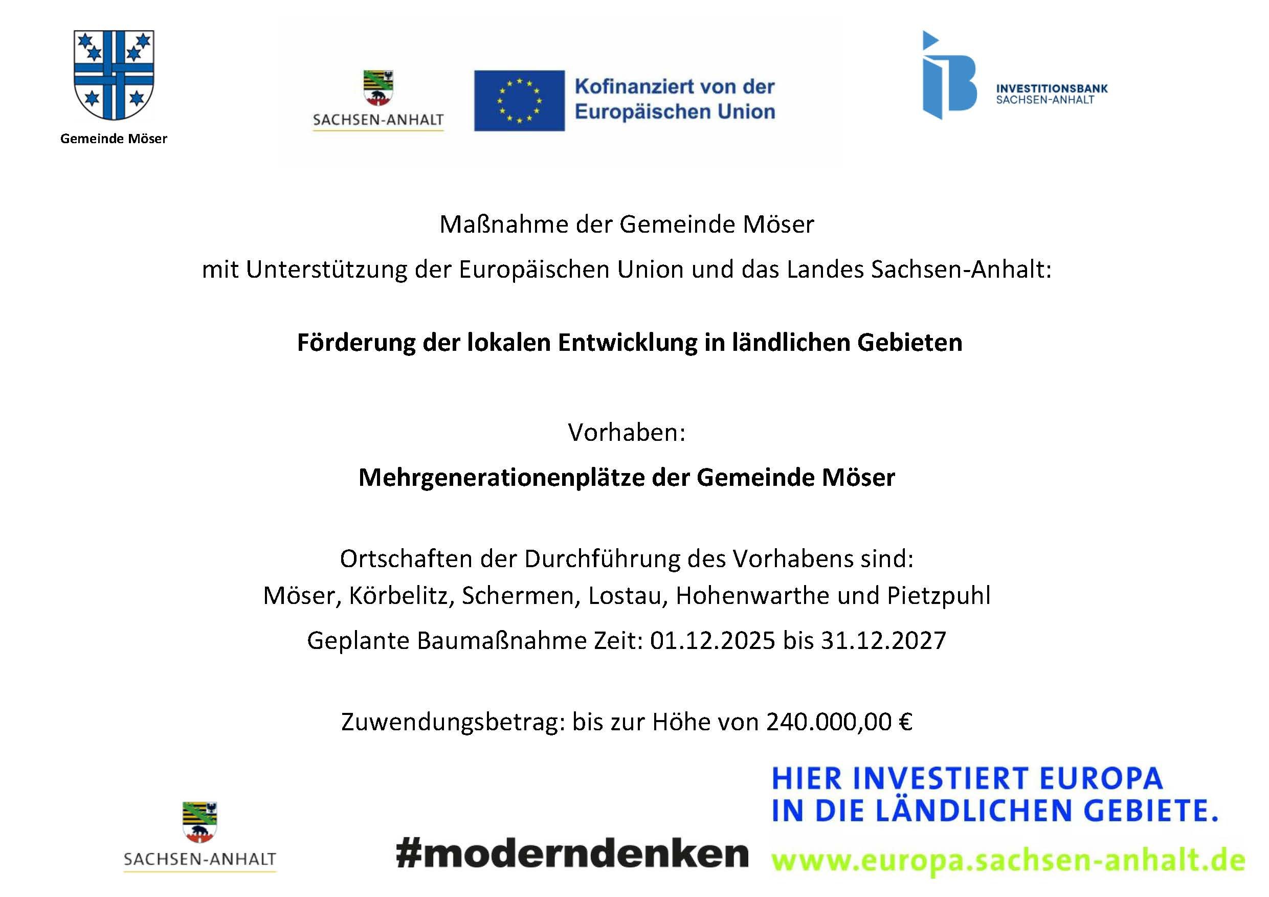 Die Gemeinde Möser startet ein zukunftsorientiertes Projekt zur Stärkung des sozialen Miteinanders in ihren Ortsteilen. Mit Unterstützung der Europäischen Union und des Landes Sachsen-Anhalt werden in den Ortschaften Möser, Körbelitz, Schermen, Lostau, Hohenwarthe und Pietzpuhl neue Mehrgenerationenplätze geschaffen.