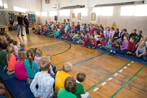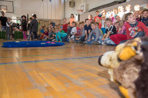 Auch in diesem Jahr kamen nämlich die Wiener Schauspieler nach Möser, um hier ein Stück aufzuführen. Nach der Zauberflöte und Schneewittchen in den Vorjahren, hieß das diesjährige Stück „Peter und der Wolf“. Ein Musikalisches Märchen, welches als Workshop des Musikunterrichtes fungierte und allen Kindern riesigen Spaß bereitete. Ziel des Workshops war es, wie einst 1936, als das Stück zum ersten Mal im Moskauer „zentralen Kindertheater“ aufgeführt wurde, die Kinder an die Musik und Hörstücke durch Leitmotive heranzuführen. Instrumente und Melodien sind festen Figuren und Handlungselementen zugeordnet und schaffen so durch ihren Klang emotionale Verbindungen zu bestimmten Eigenschaften. Das klappt natürlich noch viel besser, wenn das Publikum selbst Teil des Stückes ist. So wurden nicht nur die Hauptcharaktere Vogel, Ente, Katze, Großvater, Wolf, Jäger und der Peter von den Grundschülerinnen und Grundschülern selbst gespielt, sondern auch die einzelnen Bewegungsabläufe wurden gemeinsam mit vorgeführt. So konnte die Geschichte vom tapferen Peter und dem bösen Wolf mit viel Witz und Mitmachelementen erzählt werden. Nachdem das Bühnenbild gemeinsam aufgebaut und die kleinen Schauspielerinnen und Schauspieler mittels Kostümen in ihre Rollen geschlüpft waren, leiteten zwei Wiener Schauspieler ihre jungen Kolleginnen und Kollegen durch das Stück. Flöte, Oboe, Klarinette, Fagott, das Horn, die Pauke und die Geige wurden noch einmal vorgestellt, ehe der Kapellmeister zum Auftritt bat. Am Ende, wir wissen es alle, verschonen die Jäger den Wolf, der Großvater schimpfte und Peter war der Held. Nur die Ente erlebte das Ende der Geschichte nicht, sie wurde ja bekanntlich vom Wolf gefressen.